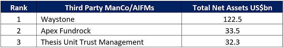 Across Third Party ManCo/AIFMs, Waystone retains its leadership with both the largest assets and the highest number of sub-funds with a total of 224. Apex Fundrock climbs to second place and Thesis Unit Trust Management descends to third.